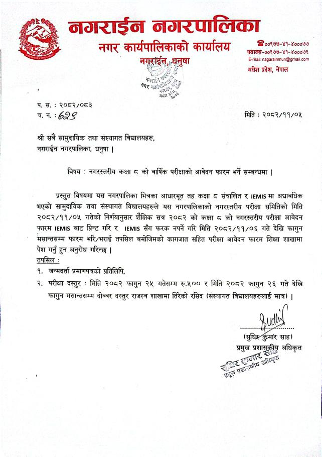 नगरस्तरीय कक्षा ८ को वार्षिक परीक्षाको आवेदन फारम भर्ने सम्बन्धमा