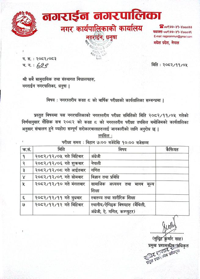 नगरस्तरीय कक्षा ८ को वार्षिक परीक्षाको कार्यतालिका सम्बन्धमा