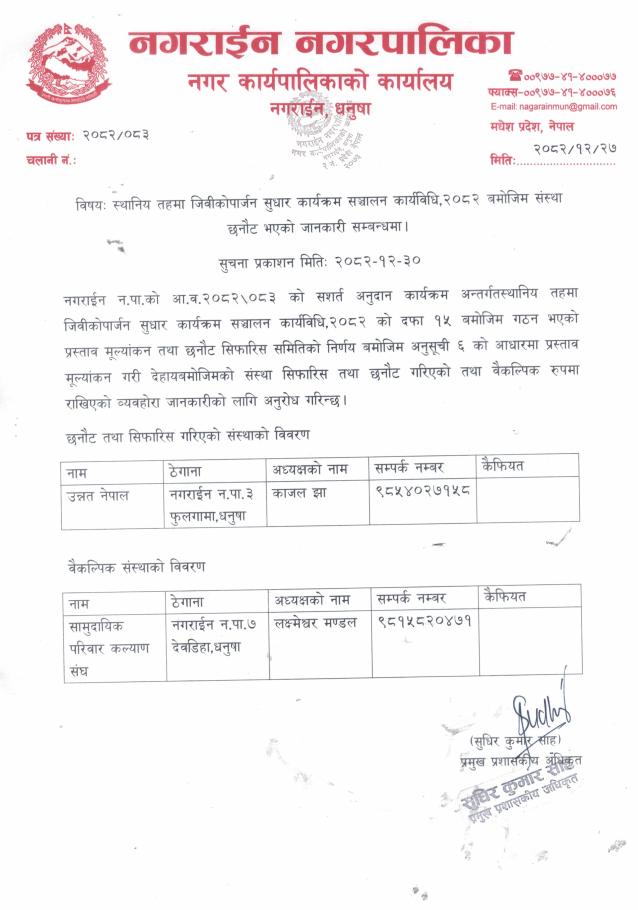 स्थानीय तहमा जीविकोपार्जन सुधार कार्यक्रम संचालन कार्यविधि २०८२ बमोजिम संस्था छनौट भएको जानकारी सम्बन्धमा